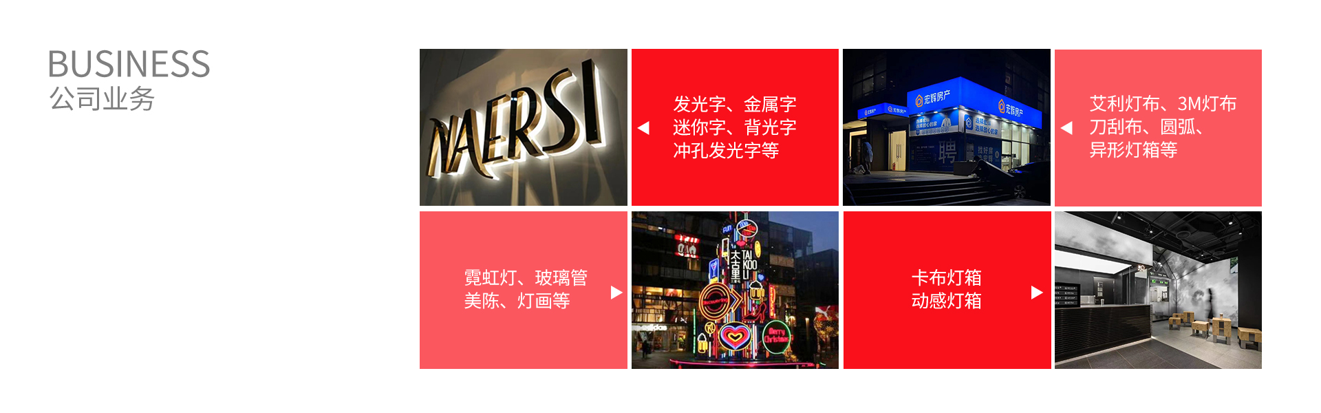 本公司专业制作发光字 、霓虹灯、灯箱、户外广告、企业形象墙Logo标识,商业门头店招、橱窗及展板展示、连锁店灯箱、宣传设计、LED电子显示屏,滚动灯箱、超薄灯箱 、写真、喷绘等。